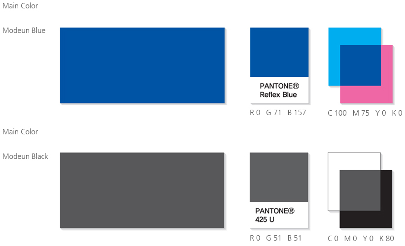 In addition to the word mark, the brand-only color is a basic element that is the core of 'Modeun Elevator CI communication', and it is chosen to convey the image of 'Modeun Elevator' well. In the case of printing, the expression of the exclusive color for the brand can be expressed by the spot color printing method according to the characteristic of the applied medium although the principle color printing is performed in principle.